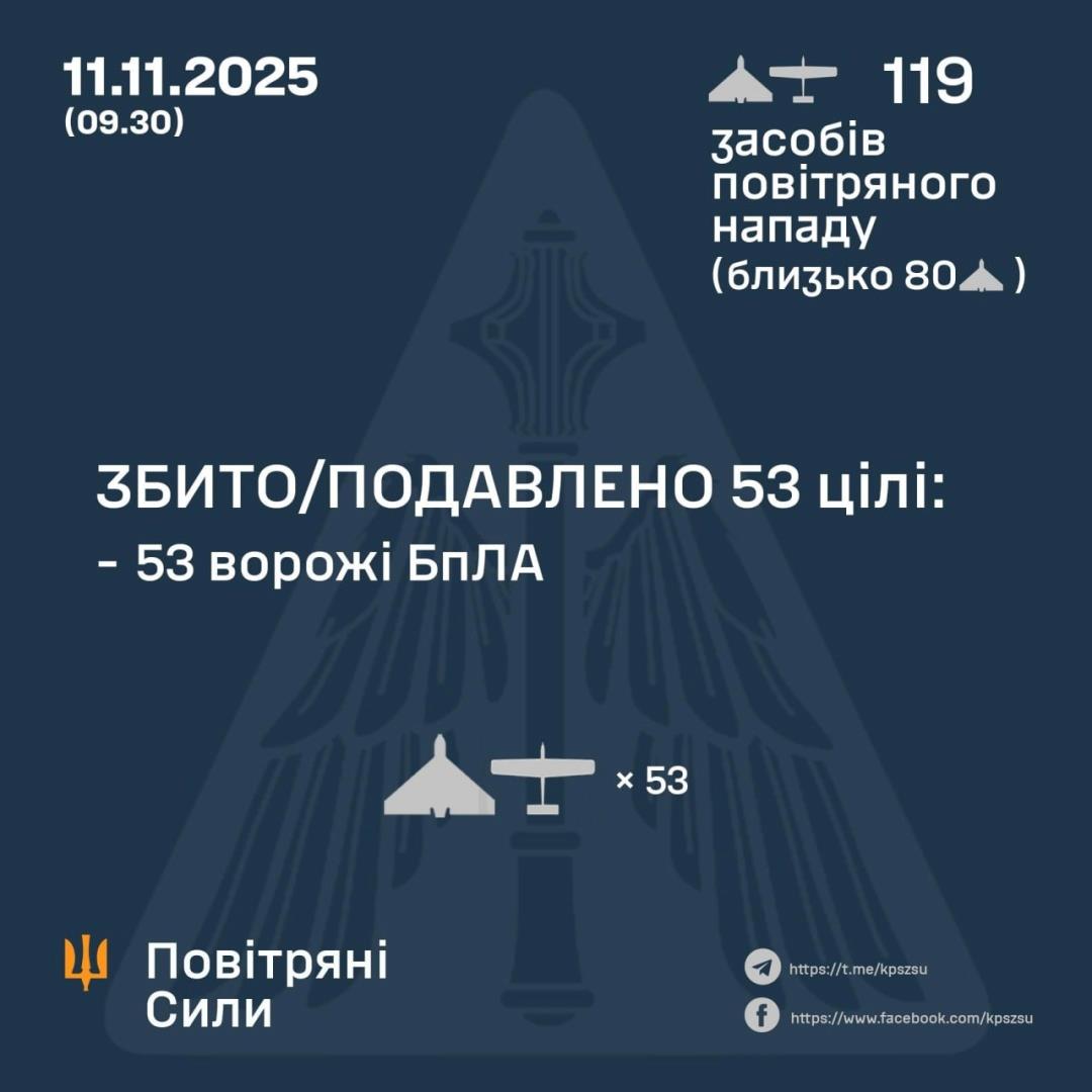 According to preliminary data, as of 9:30 a.m. on Tuesday, November 11, Air Defense Forces shot down/jammed 53 UAVs in the north, east, and south of Ukraine.