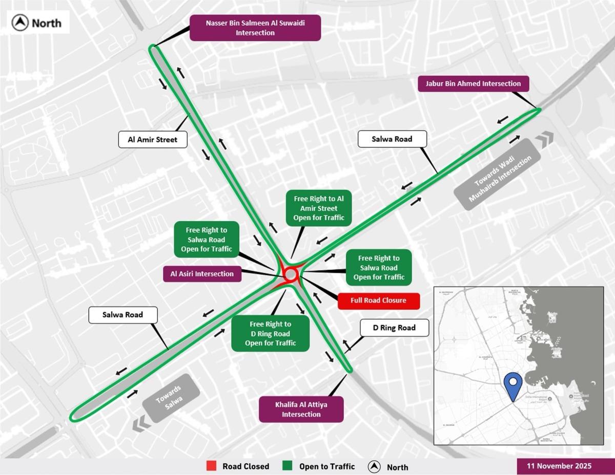Doha, Qatar: The Public Works, Ashghal announced a temporary full road closure of Al Asiri Intersection from all directions.