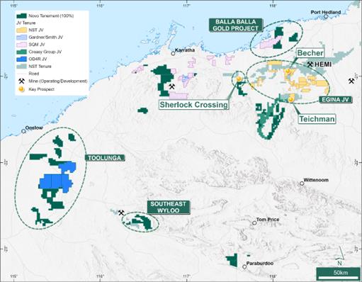 Figure 1: Novo Pilbara and Onslow District Tenure showing priority gold prospects and location of the Teichman area and Sherlock Crossing drilling.