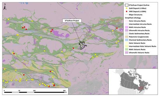 Figure 2. Regional geology with significant gold and VMS deposits and O'Sullivan Project location