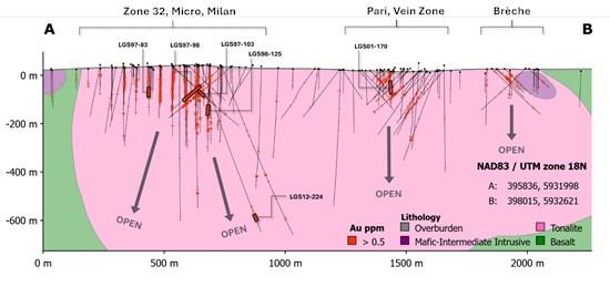 36.0 metres @ 3.37 g/t Au (LGS97-103) 47.4 metres @ 2.06 g/t Au (LGS01-170)