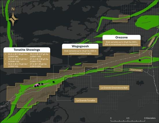 Figure 2. La Grande Project map showing 40km of Archean gold trend, historic drilling and sampling results.