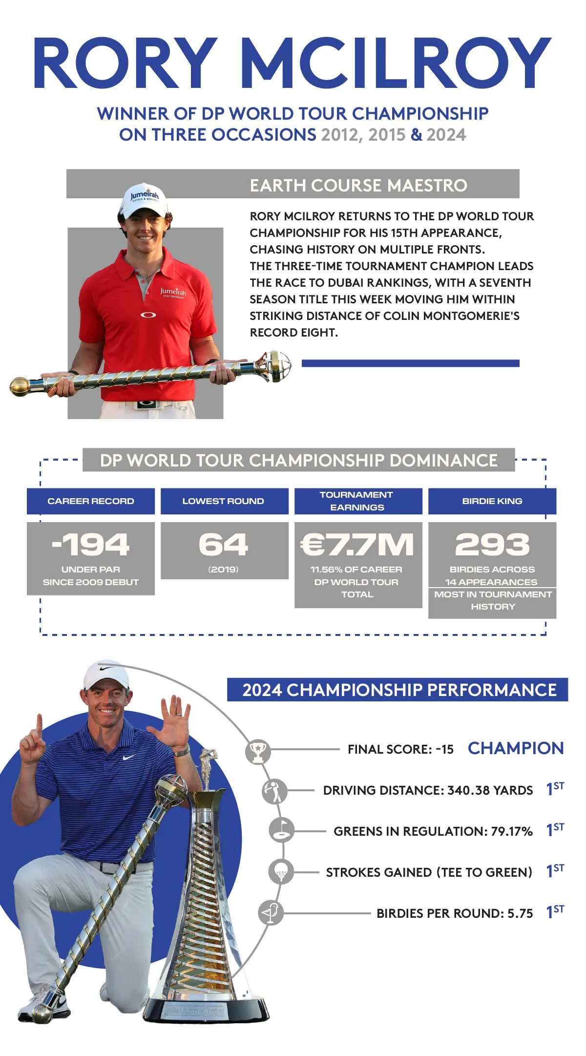 The reigning Masters Champion heads into the season-ending DP World Tour Championship with a 767-point lead over nearest challenger Marco Penge in the Race to Dubai standings and in pole position to win the season-long race for a fourth year in a row. If he achieves his aim on Sunday, the Northern Irishman would become a seven-time Race to Dubai champion, moving past Seve Ballesteros on six and closing to within one win of Colin Montgomerie's record of eight. With 2,000 points awarded to the winner of the final Rolex Series event of the season at Jumeirah Golf Estates this week, McIlroy knows victory is not a foregone conclusion but he wants to continue moving up a list that contains some illustrious names. He said:“To move from six to seven titles, to go one past Seve would be amazing. To get one closer to Monty (Montgomerie) would be amazing. “But I think when I say I'm not chasing anything, I think if I focus my energy on certain tournaments and try to play well at certain tournaments, then the Race to Dubai almost just sort of takes care of itself. “Hopefully these season-long awards are something that just come along because you've won some big tournaments along the way. “So yeah, I guess you could say I'm still chasing that, but I think that's just more a by-product of playing the good golf that I know that I can.” McIlroy had led Penge by 441 points ahead of last week's Abu Dhabi HSBC Championship but extended his lead after making an eagle and eight birdies in a flawless 62 on Sunday to finish in a tie for third. He is hoping to keep up the momentum in Dubai at a tournament he has won three times, including last year. “Obviously it was a great day on Sunday,” said McIlroy.“It looked like I was probably going to have a similar cushion over Marco to what I had last week but I was able to turn it on on the back nine and make a few birdies and give myself a chance to win the tournament, but also a little bit more of a lead going in here. “So I thought last week was overall pretty good. I certainly played really well on the weekend. Found myself in a familiar position going into this week, going out last on Thursday, and you know, it will be good to tee it up again alongside Marco. I'm excited for a great week. “I feel like my game rounded into some really good form at the weekend, and hopefully I can continue that from Thursday on.” World Number Two McIlroy was speaking on the day that the DP World Tour announced the inauguration of the Rory McIlroy Award, a new annual trophy named in honour of Europe's first winner of the Career Grand Slam. The award will be presented to the individual member of the DP World Tour who performs the best across all four Major Championships in a season. McIlroy becomes the fifth person to have a DP World Tour award named after them and he said:“It's an amazing honour to have my name up there along with Harry Vardon, Sir Henry Cotton, Seve Ballesteros and John Jacobs, that's very special.”