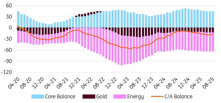 In August, Turkey recorded its strongest current account ever at US$5.5bn vs US$4.9bn surplus in the same month of 2024. A comparison with last year reveals that the improvement was driven by higher services income attributable to a further increase in transportation and tourism revenues, a lower net energy trade deficit and a better primary income balance. We expect the persistent weakness in domestic demand to help contain the current account deficit this year, keeping it around 1.3% of GDP.