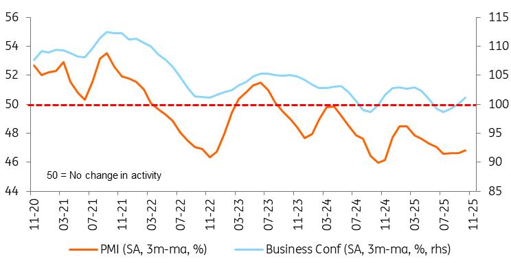 The manufacturing sector PMI, which has been below the 50 threshold since the first quarter of 2024, dropped further into contractionary territory to 46.5 in October from 46.7 in September (on a seasonally adjusted basis). The average in 3Q fell to 46.6 from 47.1 in 2Q, while the weak start to the last quarter of 2025 confirms ongoing weakness on the supply side.