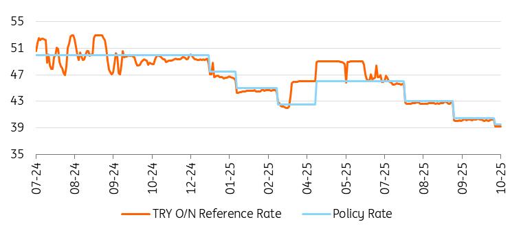 At its October rate-setting meeting, the Central Bank of Turkey kept the asymmetrical interest rate corridor unchanged but slowed the pace of easing, cutting rates by 100bp to 39.5%, down from 250bp in September and 300bp in July. Estimates were ranging from 38% to 40.5%, while the prevailing expectation was a slowdown in rate cuts to either 100bp or 150bp rather than a pause.