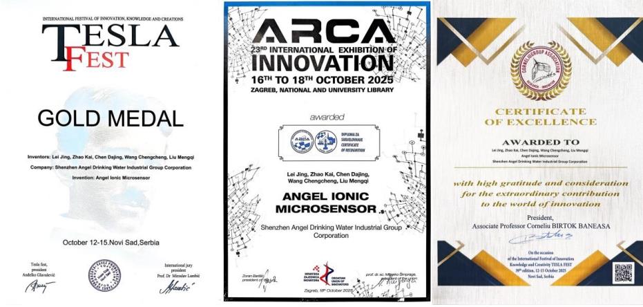 At TESLA FEST, ANGEL's V12 Diaphragm Pump and AIMS Ion Micro-Sensor impressed judges with their pioneering designs and technological impact, both receiving Gold Medal and Technical Excellence Certificates. Shortly thereafter, at ARCA 2025, the V12 Diaphragm Pump earned the Invention Bronze Award, while the AIMS Ion Micro-Sensor received an ARCA Recognition Certificate, reaffirming the global competitiveness of ANGEL's water purification technology.