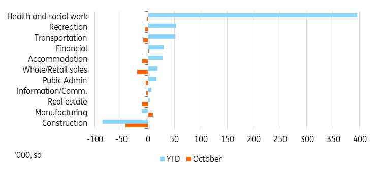 By industry, manufacturing hiring increased 10k for the first time in five months, and business sentiment recently improved slightly. This offers hope for a continued recovery. However, construction and service hirings were quite weak. Construction shed jobs 42k, not fully reversing the previous month's 51k gain. We expect construction to bottom out in the fourth quarter. However, today's data was somewhat discouraging compared to our view. Hirings remained subdued throughout key service sectors, including wholesale and retail trade (-20k), transportation (-9k), hospitality (-11k), and real estate (-11k).