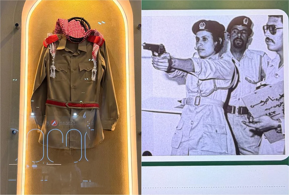 A journey that began in 1956The display opens with a simple yet powerful image, the old Dubai Police uniform, a khaki shirt paired with a red-and-white ghutra and rope agal, framed neatly under warm lights. Next to it hangs the current ceremonial uniform, its design more structured, its insignia polished gold. Together, they trace nearly seven decades of service and discipline.