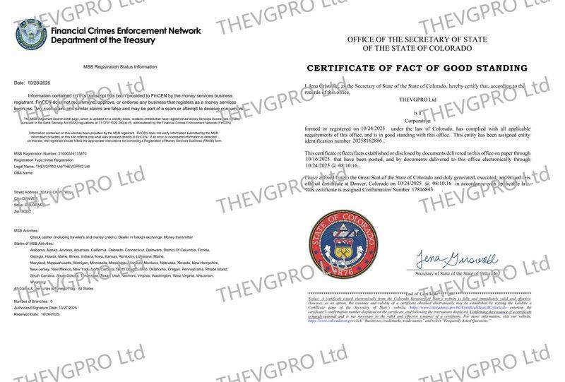 As a formally registered entity in the U.S. (registration number 20258162886), THEVGPRO has obtained an MSB registration license from the Financial Crimes Enforcement Network (FinCEN) of the U.S. Treasury Department (license number 31000314115870) and holds a federal tax identification number EIN 39-5056252 from the IRS. The company is currently in Good Standing status with the state government and continues to operate in compliance. All reserve assets are custodied by regulated financial institutions, employing MPC (Multi-Party Computation) technology and a cold-hot wallet separation mechanism to ensure fund safety. THEVGPRO will release independent quarterly reserve audit reports issued by international auditing firms, disclosing reserve balances and safety ratios to achieve complete transparency in trust verification.
