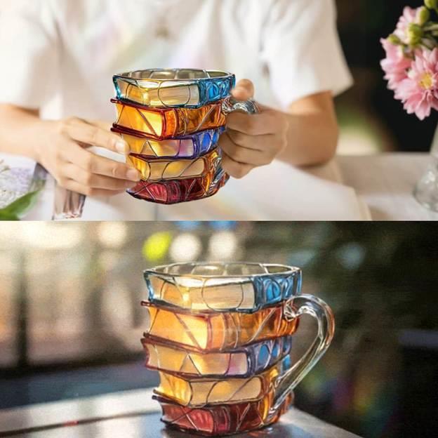 3. Vivid Color-Fusion Process: Unlike ordinary mugs that rely on paint or print overlays, the Vueeze BookHaven Mug's color is born within the glass itself. Using a specialized fusion technique, molten pigments are layered and sealed inside the material during the cooling process. This method gives the mug its enchanting translucent colors, hues that glow when sunlight or warm liquid passes through. The result is a play of light that changes throughout the day, transforming the mug into a small sculpture of shifting tones.