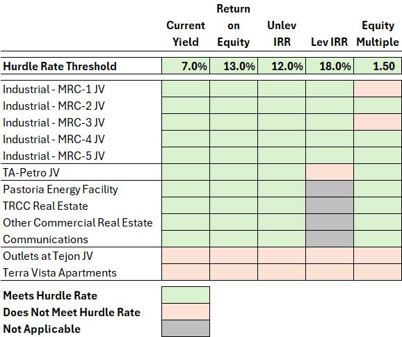 The best way to chart a path forward is to understand where we've been. At Tejon Ranch Company, that means analyzing the performance of our existing investments against our hurdles and then changing course or divesting from those investments which do not provide acceptable returns, and increasing our capital investment in those which outperform. The chart below is a summary of the investment return metrics for our existing revenue generating investments, with hurdles achieved shown in green.