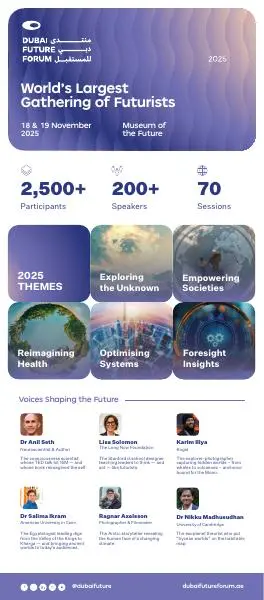 Organised by Dubai Future Foundation (DFF) at the Museum of the Future, the forum will convene more than 200 speakers and over 2,500 participants from 100 leading institutions and organisations worldwide. Discussions will span five key themes: Exploring the Unknown, Empowering Societies, Reimagining Health, Optimising Systems, and Foresight Insights. Immersive Experiences in AI and XR: This year's forum will expand beyond dialogue to include interactive foresight activations leveraging Artificial Intelligence (AI) and Extended Reality (XR) technologies, including Virtual Reality (VR) and Augmented Reality (AR) applications - offering participants an experiential glimpse into the frontiers of innovation. Day 1 Highlights: The forum will open with a keynote address by His Excellency Khalfan Belhoul, CEO of Dubai Future Foundation, setting the tone for discussions around global foresight, innovation, and human progress. The opening plenary session -“Building a Regenerative Society: How Do We Redesign Our Foundations?” - will feature Dr Alaa Murabit, Managing Partner at 500 Global, in conversation with Indy Johar, Co-Founder of Dark Matter Laboratories. A keynote session titled“Governance for the Long Term: How Can We Ensure Intergenerational Fairness?” will bring together Her Excellency Lucie Berger, EU Ambassador to the UAE; Esala Nayasi, Deputy Secretary General of the Pacific Islands Forum Secretariat; and Dr Cécile Aptel, Deputy Director of UNICEF Innocenti – Global Office of Research and Foresight. The discussion will be moderated by Dr Florence Gaub from NATO Defense College. Further highlights include:“Mapping Inner Worlds: Can We Decode Human Consciousness?” featuring Dr Giulio Tononi, Director of Wisconsin Institute for Sleep and Consciousness; Dr Anil Seth, neuroscientist and author; and Dawn Nakagawa, President of Berggruen Institute; and a session titled“Teaching Futures: What Does It Take to Build Foresight Capacity Worldwide?” featuring Sobhi Tawil (UNESCO), Dr Doris Viljoen (Stellenbosch Business School), Dr Kuo-Hua Chen (Tamkang University), and Dr Sohail Inayatullah, UNESCO Chair in Futures Studies. These also include“Innovation Without Borders: How Do We Unlock the Full Power of Global R&D?” featuring Khalifa Al Qama, Director of Dubai Future Labs; Max Mirgoli (imec); and Carlos Nizam (Emirates Global Aluminium) and Tuya Altangerel from the United Nations Development Programme; and“The Precision Leap: Is Healthcare Ready for the Age of Anticipation?” featuring Dr Yacine Hadjiat (Dubai Health), Dr Jeffrey Glenn (Stanford University), and Tina Woods (International Institute of Longevity), moderated by Dr Andy Poh (University of Birmingham). Sessions will also explore the intersection of culture, society, and markets, including“The Global Consumer 2035: What Are World Markets Telling Us About the Future?” featuring Linda Arvidsson (H&M Group), Anuradha Chugh (The Bio-Leadership Project), Michael Costigan (Salesforce), and Meabh Quoirin (Foresight Factory); and a session titled“Ocean Breakthroughs: What Futures Await Beyond the Depths?” with Dr Ulrike Pfreundt (rrreefs), Karim Iliya (Kogia), and Dr Juan Antonio Romero (Dubai Economy & Tourism), moderated by Emily Sharp (The Pacific Community). The day will conclude with the“Dubai Future Solutions – Prototypes for Humanity” Awards Ceremony, celebrating groundbreaking innovations that contribute to building a better future for humanity. Day 2 Highlights: Day 2 will open with plenary sessions spotlighting cities, nature, and human creativity.