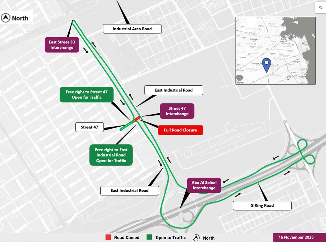Throughout this period, Ashghal urged road users to adhere to the speed limit, use all available diversion routes and consider rerouting through nearby streets to reach their destinations as indicated.
