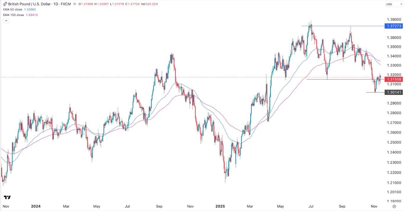 EURUSD Chart by TradingViewGBP/USD Technical AnalysisThe daily chart shows that the GBP/USD exchange rate has remained on edge in the past few months. It has slumped from the September high of 1.3727 to the current 1.3172.It formed the risky double-top pattern, a popular risky pattern whose neckline was at 1.3150. It then retested the neckline, confirming the break-and-retest pattern.The pair has remained below the 50-day and 100-day Exponential Moving Averages (EMA). Therefore, the most likely scenario is where it continues falling, with the next point to watch being at 1.3015, its lowest level this month.Ready to trade our free trading signals? We've made a list of the best UK forex brokers worth using.