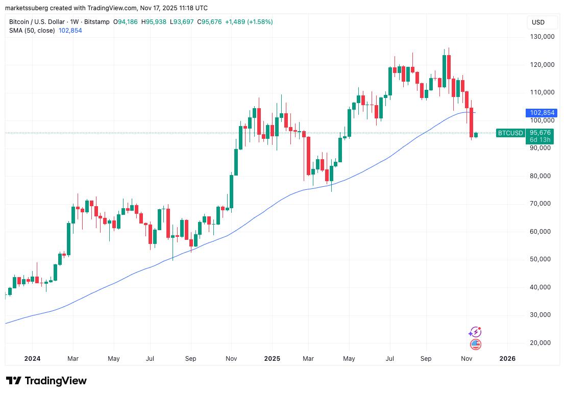 Bear Market Confirmations and Technical BreakdownAdding to bearish outlooks, Bitcoin recently lost support from its 50-week simple moving average (SMA), which sits at approximately $102,850. The weekly candle close below this key support level is unprecedented in Bitcoin's recent history and signals potential return to prolonged bear territory.