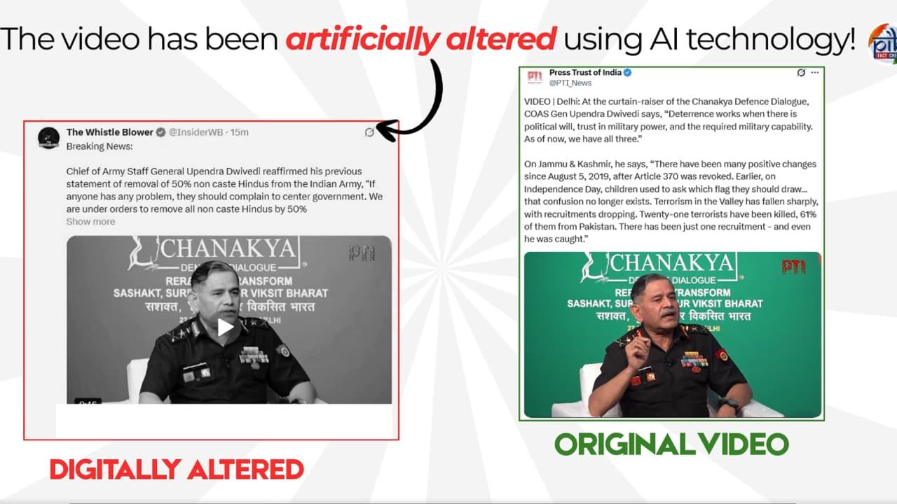 To counter the misinformation, the PIB shared the original, unedited video, which clearly shows that the Army Chief did not make the alleged remarks. The authentic footage, available on the official PTI News handle, highlights how the manipulated clip was digitally altered to create a false narrative.