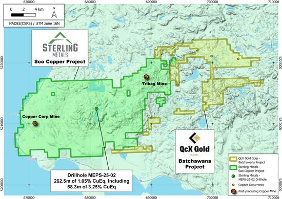 The Property directly adjoins Sterling Metals Corp.'s Soo Copper Project, where Sterling recently reported a major copper discovery featuring intervals including 262.5 m of 1.05% CuEq, 68.3 m of 3.25% CuEq, and 9.3 m of 19.8% CuEq from near-surface drilling (Sterling press release, September 29, 2025). QcX shares over 6.6 km of common boundary with the discovery area, placing the Company in the centre of one of Canada's newest and most promising emerging copper districts.