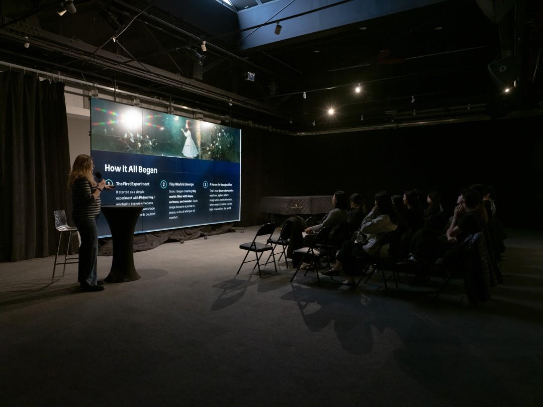 AI techniques enabled her to create hyperrealistic imagery imbued with emotional tension. Minami Matsumoto presented Coral Journey, outlining the conceptual framework drawn from her vivid underwater-inspired personal experiences and the use of AI to simulate organic ecosystems. Beatrice Mai showcased Round Table, examining the collaborative dynamics of family, the male gaze, and patriotism within Asian cultural contexts. Meanwhile, Ziyu Liu's Echo explored the interplay between nostalgia, memory, personal growth, and visual storytelling. Each artist offered a distinct perspective on workflow, conceptual development, and the evolution of their artistic practice within the context of AI.
