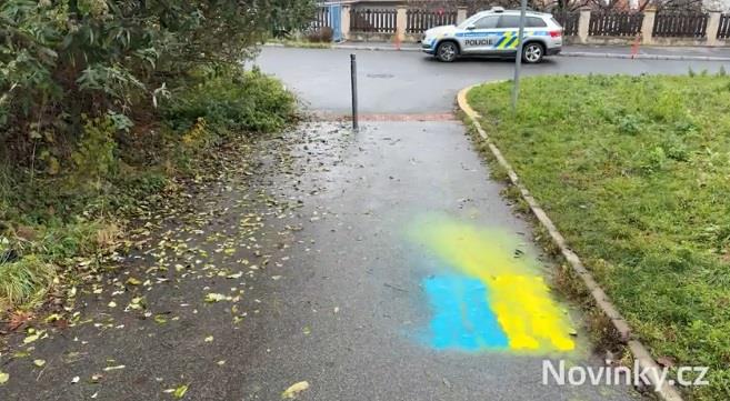 It was noted that blue-and-yellow flags were also drawn with chalk and paint on sidewalks, stairs, columns, and trash bins. Law enforcement authorities are investigating the incident.