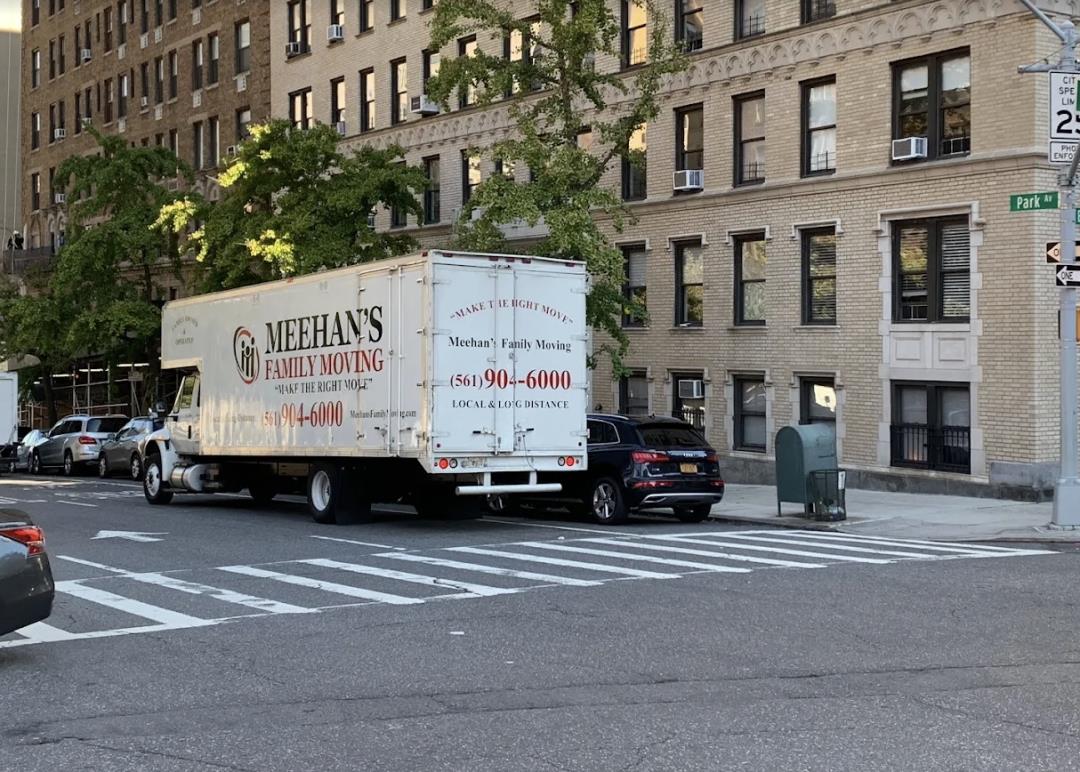 "A large Meehan's Family Moving truck stands at a residential block intersection, highlighting professional moving services in an urban area."