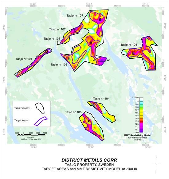 The high resolution MobileMT survey results, covering approximately 34,300 hectares at the Tåsjö mineral licenses nr 101 to 108 has successfully outlined eight low resistivity (highly conductive) anomalies (Target Areas A to H in Figure 1) consistent with the MobileMT signature observed at the Company's Viken Deposit as reported in District's news release of September 24, 2025. These results represent a major step forward in District's strategy to delineate drill-ready targets within a largely underexplored region characterized by Alum Shales enriched in vanadium, potash, uranium, molybdenum, nickel, zinc, copper, and rare earth elements (REEs).