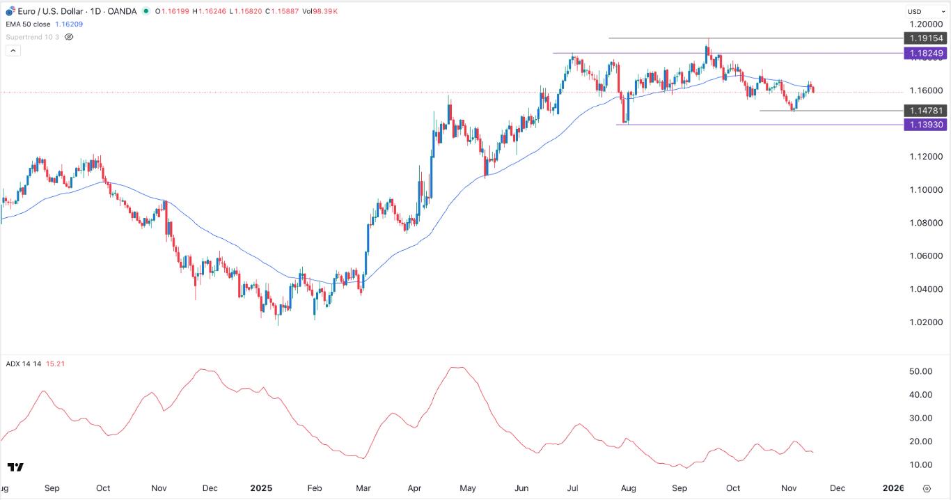 EURUSD Chart by TradingViewEUR/USD Exchange Rate Technical AnalysisThe daily timeframe chart shows that the EUR/USD exchange rate has pulled back in the past two consecutive days, moving from last week's high of 1.1640 to the current 1.1590.It has moved below the Supertrend indicator and the 50-day Exponential Moving Average (EMA), a sign that bears are in control. The pair also formed a head-and-shoulders pattern, a common bearish reversal sign.The Average Directional Index has pointed downwards, a sign that the recent momentum has faded. Therefore, the pair will likely resume the downward trend and possibly move to the key support at 1.1478.Ready to trade our daily Forex signal? Check out the best forex brokers in Europe worth using.