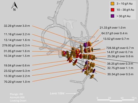 Figure 2. Zone 5 down-dip drilling with high-grade intercepts highlighted, 3.0 g/t gold cutoff, plan view. Plan view looking down with high-grade intercepts highlighted and lower levels of the mine (levels 1084 and 1066) shown in pale grey. The drill holes shown here targeted the down-dip extension of the Zone 5 lodes below the lowest levels of current mine development on levels 1084 and 1066. Most high-grade intercepts are within 50 m of current underground mine development and are scheduled for mining in the next 6-12 months.