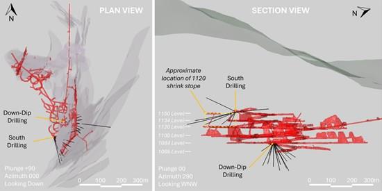 The Level 1120 up-dip drill program was conducted from one underground drill station located off the Main Decline on Level 1160. The program consists of a fan of drillholes drilled on approximately 15 m centers designed to infill a panel of the deposit approximately 150 m wide and 58 m tall. This drill program is ongoing and is primarily targeting mineralization within the planned 1120 shrink stope, which is based on Level 1120 and extends up above Level 1150 towards Level 1170.