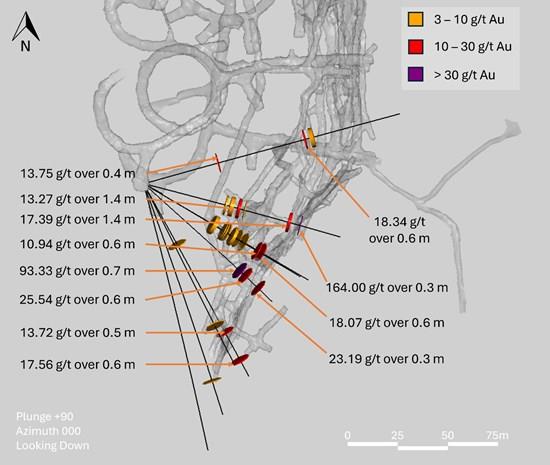 Drilling was conducted from two near surface underground drill stations. The Company intersected high-grade mineralization in 22 drillholes, most of which did not exceed 130 m in length. Most of the high-grade drill intersects are located within 50 m of underground developments, including the headline intercept of 728.56 g/t over 0.7 m, which is approximately 25 m below current mine levels. Other high-grade gold assay results include 279.00 g/t over 0.3 m, 189.99 g/t over 0.3 m, and 164.00 g/t over 0.3 m. Previous drilling in this part of the mine has returned similarly high-grade results over narrow widths such as 175.93 g/t over 0.9 m, 236.00 g/t over 0.4 m, and 690.22 g/t over 1.2 m (see press releases dated October 9, 2025, May 1, 2025, and January 23, 2025 respectively). Due to the proximity of these drill results to existing workings, most of these drill intercepts are anticipated to be incorporated into the mine plan in the next three to twelve months.