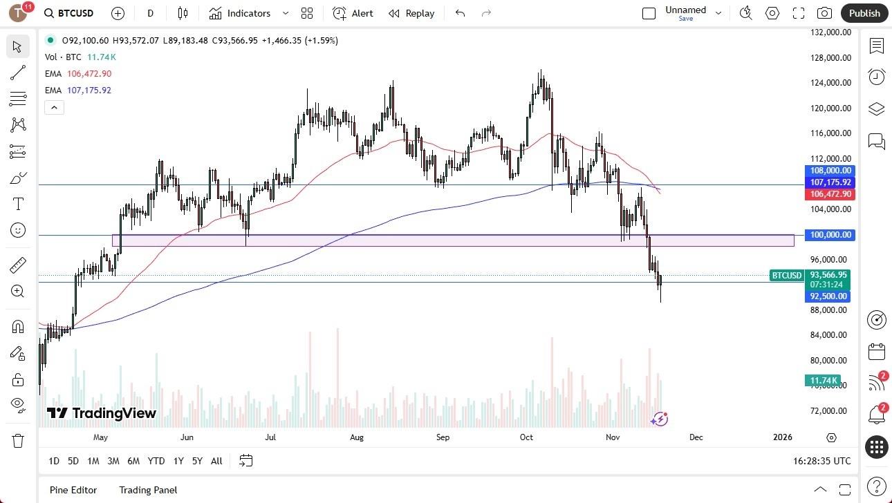- Bitcoin showed a sharp early drop before reversing into a hammer near $92,500, hinting at an oversold bounce. The key battleground remains $100,000, with failure there risking deeper losses and a break signaling possible trend recovery.