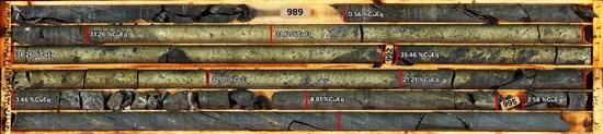 The 23.83% CuEq over 6.3 m in hole 1274-17-269W5 represents a 3,500 CA$/t material at today's metal prices and exchange rate. This is 10 times the grade of the nearby historic holes 1274-17-260 and 1274-17-269, which returned 2.4% CuEq over 10 metres and 2.7% CuEq over 12 metres, respectively. This remarkable grade is associated with a thick massive chalcopyrite stringer, similar in nature to the stringers present in the copper stringer zone. The local presence of such shoots is observed in other areas so it seems to be a characteristic of this ore body, which in return has the potential to generate a notable positive impact on the future production forecasts.