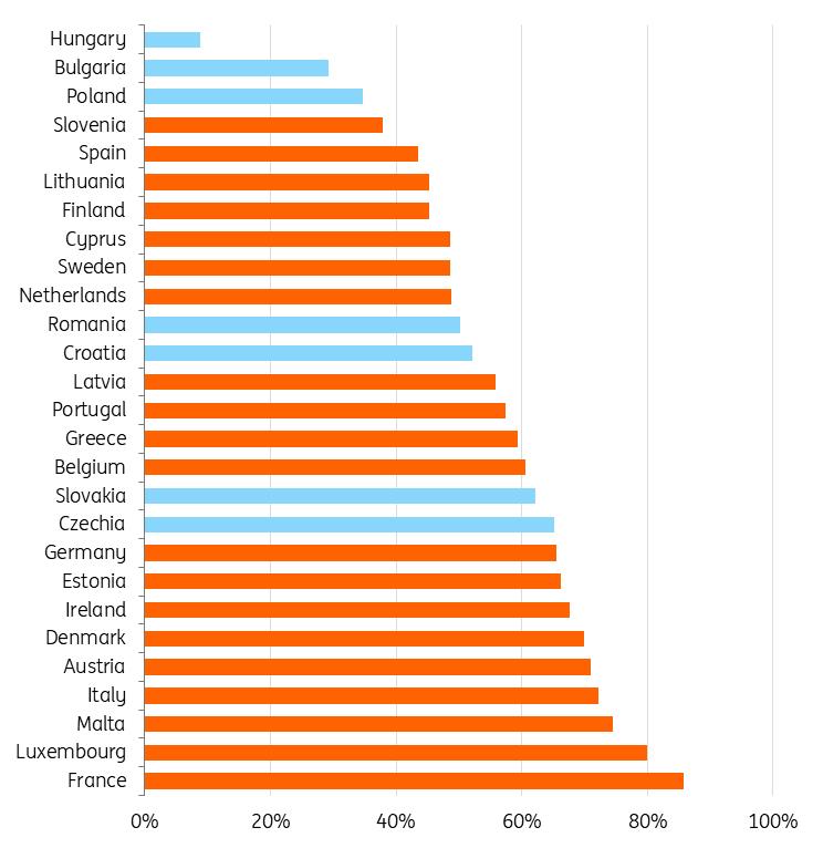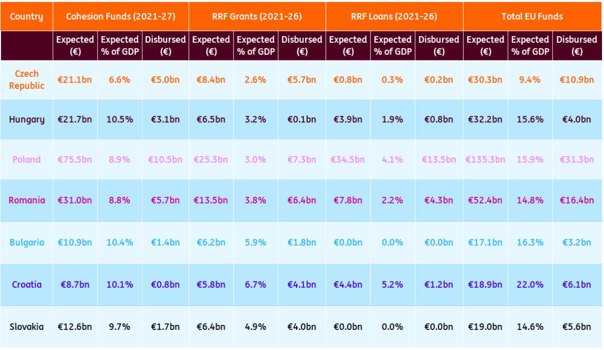 RRF deadline puts pressure on absorption ratesWith the 2026 deadline for RRF payments looming, the absorption rate so far has been mixed for CEE sovereigns. Across grants and loans, Hungary is the biggest laggard, with just €920mn in RRF funding disbursed, representing 9% of the planned allocation. Bulgaria has also been slow, with a 29% absorption rate, although the country received approval for its modified RRP this summer, before receiving part of its second tranche (€439m) recently. Poland has been making progress, but is still among the worst performers within the EU (35% absorption, vs the EU average of 54%). Slovakia and the Czech Republic stack up better, above the EU average, albeit well below France's leading 86% in the EU.