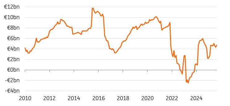 Looking ahead to next year and with the RRF facility expiring in August 2026, the government faces pressure to accelerate reforms and project implementation, notably in infrastructure, healthcare, and digitalisation. That said, 2026 could theoretically be a record year in terms of EU funds inflows, with almost EUR11bn left from the renegotiated RRF, plus a lower but still significant amount from the Cohesion Funds (say around EUR4-5bn). However, persistent administrative inefficiencies, political uncertainty, and slow project execution continue to hinder full absorption of available funds. Therefore, the risk of partly losing some of the allocations remains real.