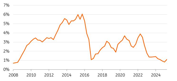 Progress in effectively disbursing these funds to final beneficiaries remains relatively slow. As of the end of 2024, Poland had transferred approximately PLN10bn from RRF grants to final beneficiaries. Of the remaining PLN100bn (approximately €23 billion, or 2.6% of Poland's GDP), it is anticipated that around 70% will be allocated to end users by 2026. Earlier this year, we expected a more even distribution of RRF payments between 2025 and 2026. This forecasts only a modest boost to investment this year, a trend corroborated by recent construction output data, while projecting a cumulation of RRF payments and robust investment stimulus in 2026.
