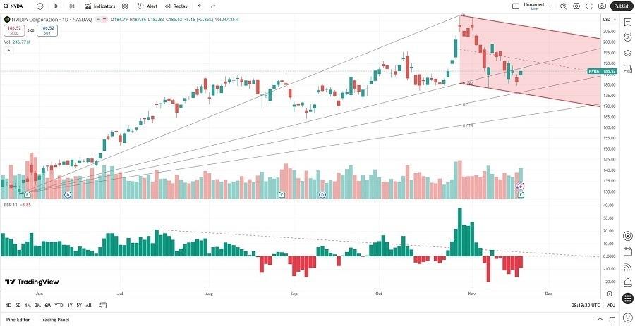 (MENAFN- Daily Forex) Third-quarter earnings beat across the board, and NVIDIA raised its outlook, but high valuations and crucial questions surrounding its core customers remain. What will followearnings?Short Trade IdeaEnter your short position between 187.86 (yesterday's intra-day high) and 195.62 (the intra-day high of the left shoulder of its potential head-and-shoulders pattern).Market Index Analysis NVIDIA (NVDA) is a member of the NASDAQ 100, the Dow Jones Industrial Average, the S&P 100, and the S&P 500 All four indices are in a bearish chart pattern, with rising downside pressure. The Bull Bear Power Indicator for the NASDAQ 100 is bearish with a descending trendline, and does not confirm the uptrend