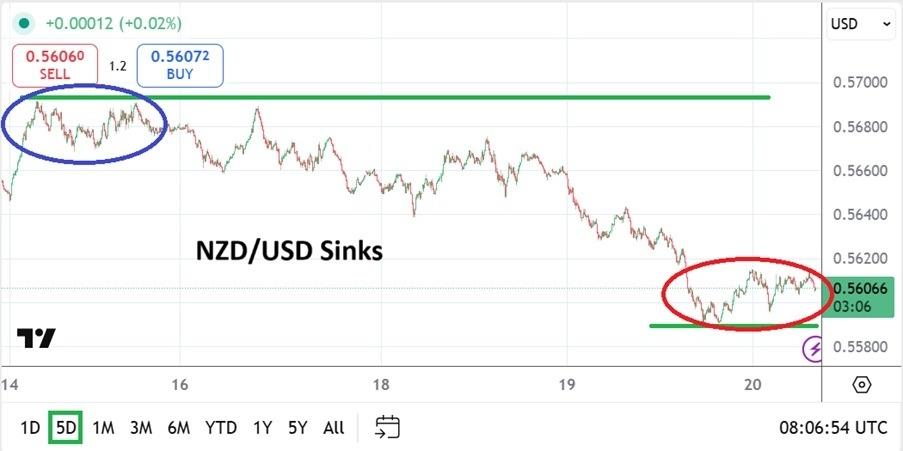 - Yesterday's steep fall and watching the NZD/USD begin to challenge the 0.56000 vicinity is likely alarming for financial institutions in New Zealand psychologically. How will they react? The U.S will release Non-Farm Employment Change data later today – this is a delayed report being published late because of the U.S government shutdown which had been in effect until early last week. The jobs data from the U.S could impact Forex and the NZD/USD. Some speculators may believe the NZD/USD has fallen too low and must move higher, but wagering on reversals higher in a sustained manner will need positive impetus. The near-term may remain quite challenging for the NZD/USD.