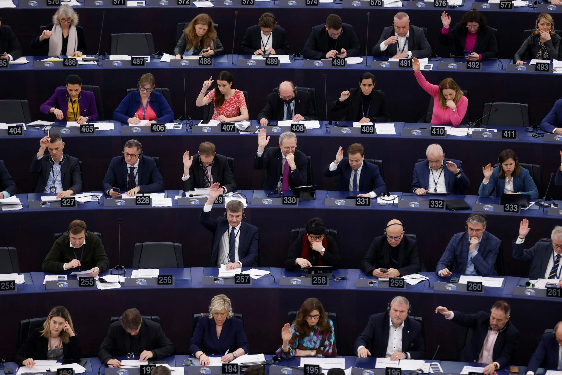 European Union lawmakers vote on an Artificial Intelligence Act at the European Parliament on March 13, 2024 in Strasbourg, France. (AP Photo/Jean-Francois Badias)