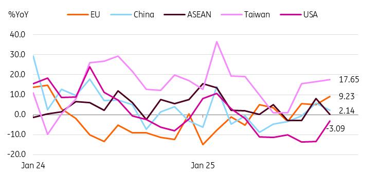 Exports to other regions rose, more than offsetting weak US exports. Exports to the EU were up sharply by 9.2% with transport equipment up 5.7% and machinery up 18.5%. Exports to China and Asia increased by 2.1% and 4.2%, driven by strong demand for electrical machinery (including semiconductors). We believe that solid global semiconductor demand and AI investment support intra-regional trade.