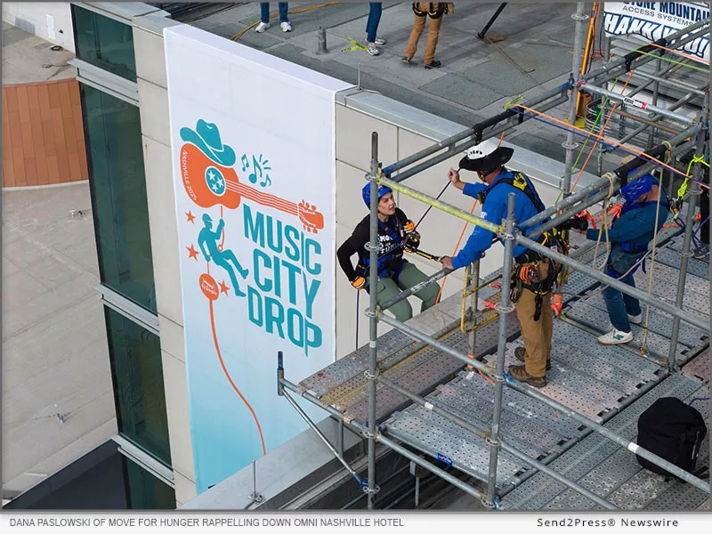 (1) Image caption: Dana Paslowski of Move For Hunger rappelling down the Omni Nashville Hotel.