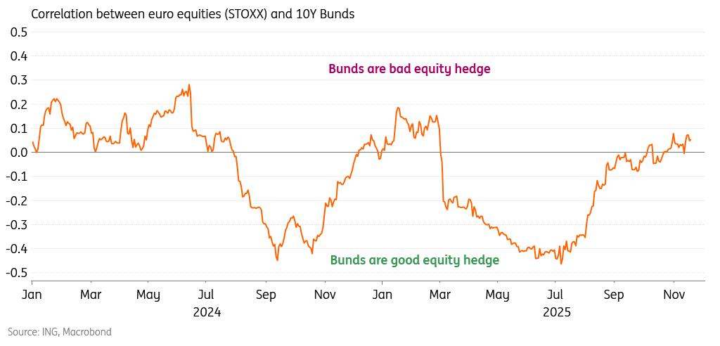 Euro rates have been remarkably resilient against the jitters in equity markets, with the NASDAQ only yesterday displaying its largest intraday swing since Liberation Day. And the low correlation between the two markets could continue. Equities have been driven strongly by the AI thrill, whereas rates are looking more at the underlying macro picture. In the eurozone, the signs point to an improving macro environment, while the foresight of more fiscal stimulus helps reduce the tail risk of falling back into a recession. This more positive outlook helped the 10Y swap rate climb 10bp at a time when the STOXX index sold off 5% in the lead up to the Nvidia earnings announcement. In fact, the correlation between equities and Bunds over the past three months is slightly positive. And with the VIX still elevated, we could very well see more equity volatility.