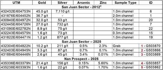 Table 1. Highlight Assay Results for 20122 and 2025 Field Investigations.