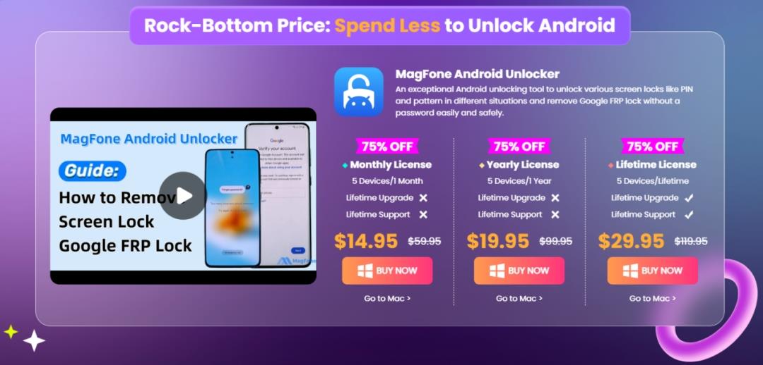 The newly launched MagFone Android Unlocker is designed to help users bypass a full range of Android device locks safely and efficiently. Whether dealing with forgotten passwords, broken screens, or Google FRP locks, MagFone Android Unlocker provides a fast, intuitive, and secure solution compatible with major Android brands, such as Samsung, Xiaomi, Vivo, Oppo, Google, Redmi, Realme, LG, Motorola, and more.