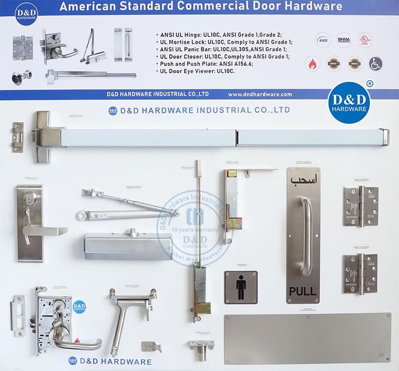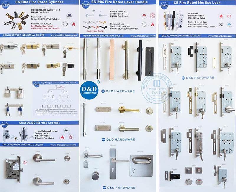 D&D HARDWARE delivers architectural hardware and complete door opening solutions for metal, fire-rated and wooden doors. Its portfolio includes stainless steel door hinges, door locks, lever handles, door closers, exit devices, door stoppers, door bolts and related accessories.