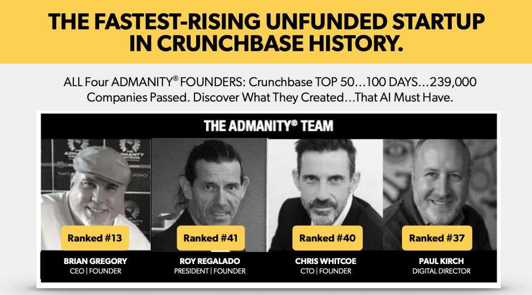 PHOENIX, AZ - ADMANITY®, a breakthrough AI company developing systematic emotional persuasion technology, announced today that all four founders have achieved rankings in the Crunchbase Global Top 50, an unprecedented accomplishment for a bootstrapped company with zero funding. CEO Brian Gregory ranks #13 globally, with co-founders Paul Kirch (#36), Chris Whitcoe (#39), and Roy Regalado (#41) completing the historic achievement.