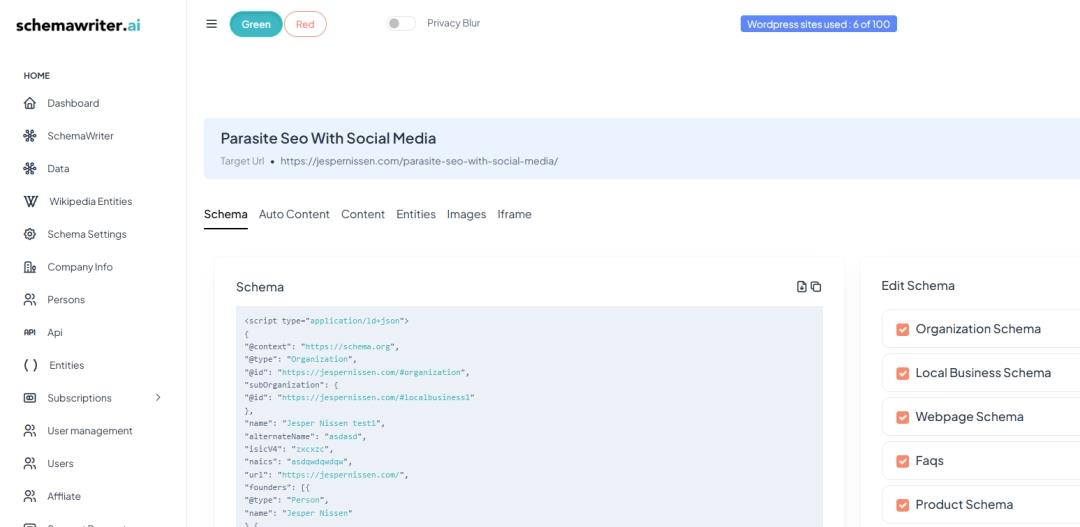 The plugin uses a simple API key setup. Users connect their schemawriter account to their Wordpress site in a secure way. They can push advanced schema markup to individual pages in just a few clicks. The schema markup remains active on the site even if the schemawriter subscription ends. Users will keep the SEO and AI visibility value they have already built.