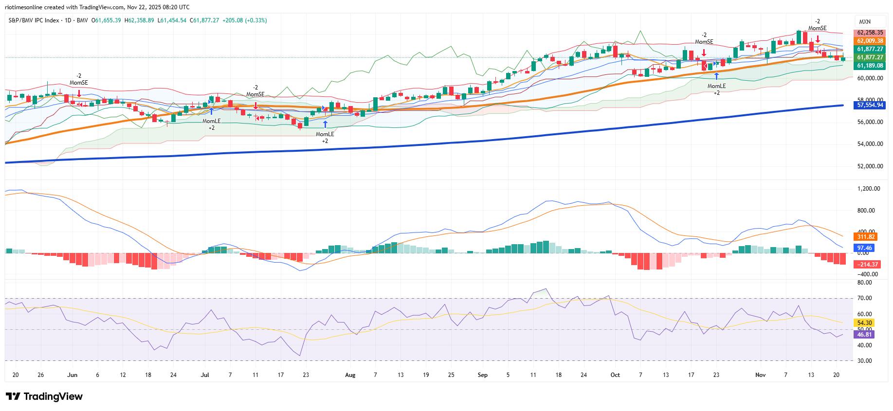 Equities told a calmer story. The S&P/BMV IPC rose about 0.4% to roughly 61,900, helped by gains in industrials and consumer names.