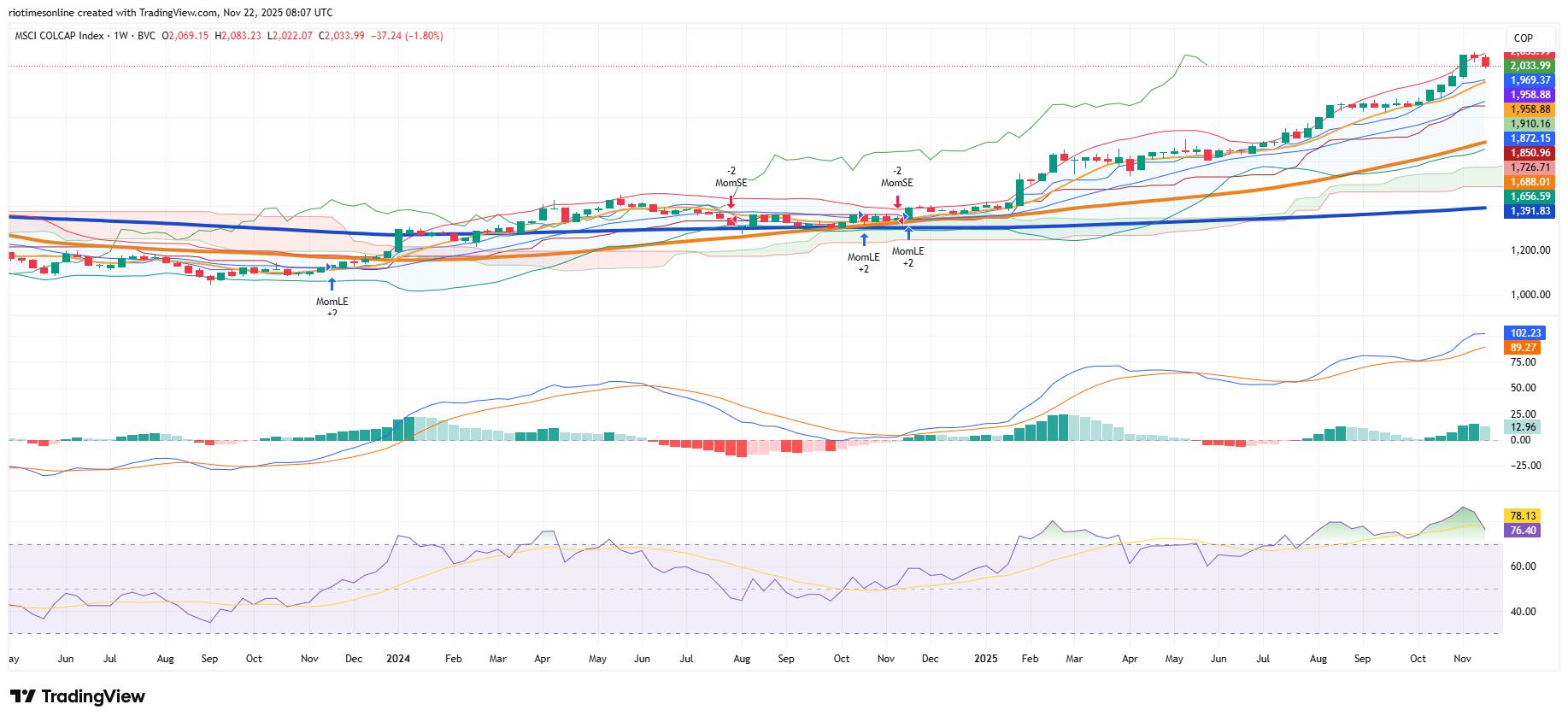 Equities mirror that“strong but tired” story. The MSCI Colcap closed near 2,034 points, up 0.24% and only a few percent below recent records, after a year in which the benchmark has surged about 44% in pesos and more than 60% in dollars.