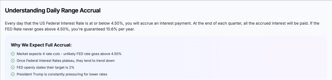 Every day that the FED Rate is at or below 4.50% you will accrue an interest payment and at the end of each quarter all the accrued interest will be paid. So if the FED Rate never goes above 4.50% you're guaranteed 10.6% a year which is what we forecast.