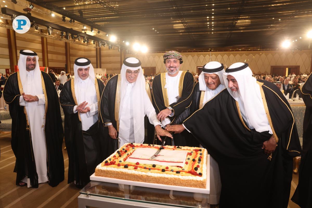Minister of Environment and Climate Change H E Dr. Abdullah bin Abdulaziz bin Turki Al Subaie, Minister of Awqaf and Islamic Affairs H E Ghanem bin Shaheen bin Ghanem Al Ghanim, Minister of Municipality H E Abdullah bin Hamad bin Abdullah Al Attiyah, Minister of State and President of the Qatar National Library H E Dr. Hamad bin Abdulaziz Al Kawari, Ambassador of the Sultanate of Oman to Qatar H E Sayyid Ammar bin Abdullah bin Sultan Albusaidi, and H E Sheikh Faisal bin Qassim Al Thani cutting a cake to mark National Day of Oman at a reception held in Doha yesterday.